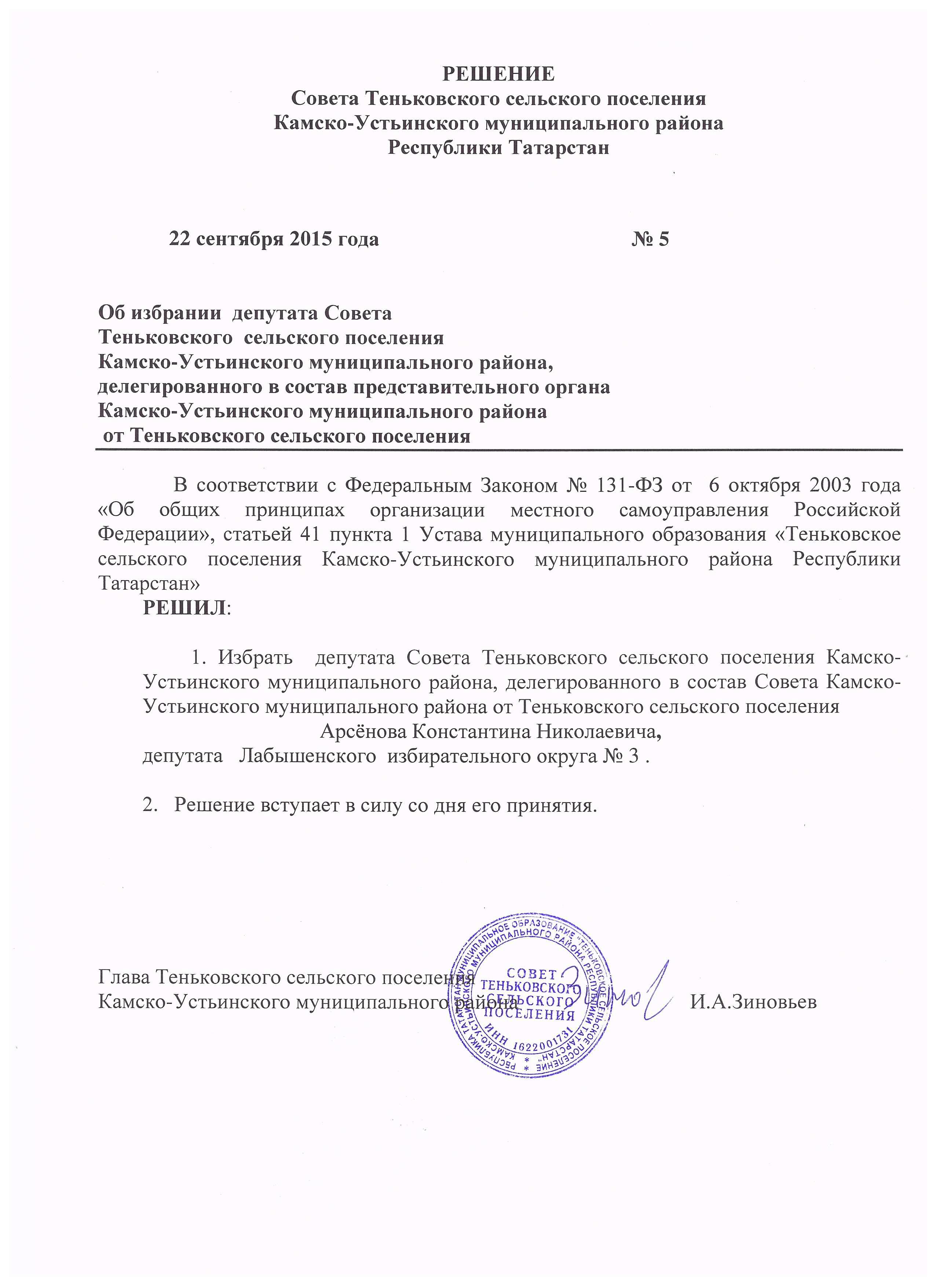 Об избрании депутата Совета Теньковского сельского поселения Камско-Устьинского муниципального района, делегированного в состав представительного органа Камско-Устьинского муниципального района Республики Татарстан от Теньковского сельского поселения