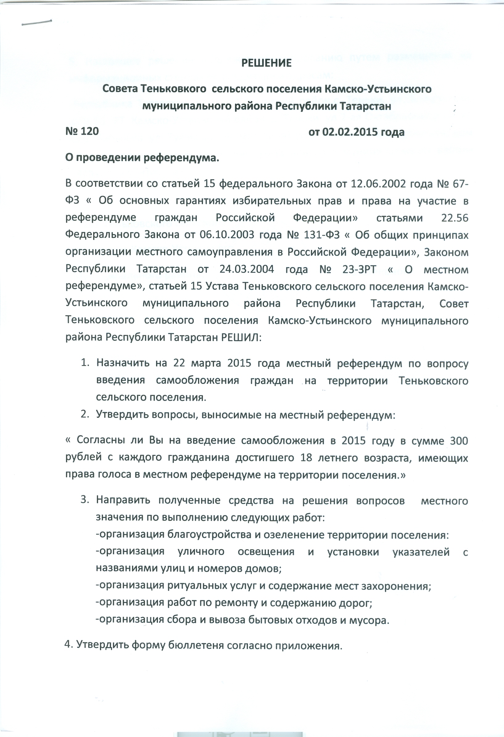Решение Совета Теньковского сельского поселения от 2 февраля 2015 года №120 "О назначении местного референдума на территории Теньковского сельского поселения по вопросу введения и использования средств самообложения граждан"