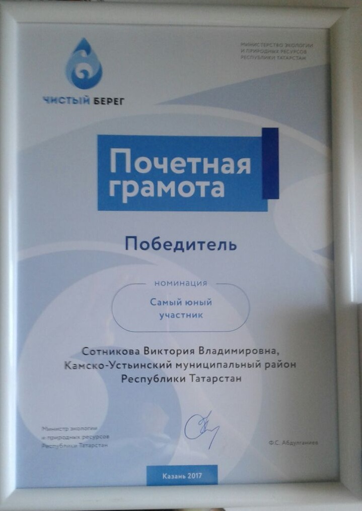 Ученица 9 класса Камско-Устьинской общеобразовательной средней школы Виктория Сотникова победила во Всероссийской акции "Чистый берег" как самая юная участница. Сегодня, 27 октября 2017 года, заместитель руководителя Исполнительного комитета по социальным вопросам Елена Сороковнина вручила подарок победительнице – смартфон Samsung и грамоту от Министерства экологии и природных ресурсов Республики Татарстан.
