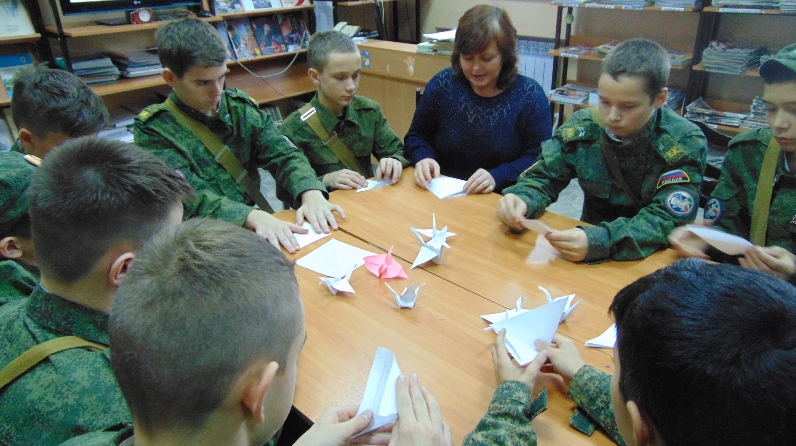 К этому памятному дню была подготовлена книжная выставка «День белых журавлей», а также литературный праздник для учащихся Кадетской школы-интерната. Ребятам рассказали об истории праздника, почему именно журавль является символом этого поэтического праздника. Вспомнили слова песни «Журавли», которая стала гимном памяти погибших во всех войнах. Затем все присутствующие почтили память павших героев минутой молчания. Ребята с большим интересом участвовали в мастер-классе по изготовлению бумажных журавликов в технике оригами.