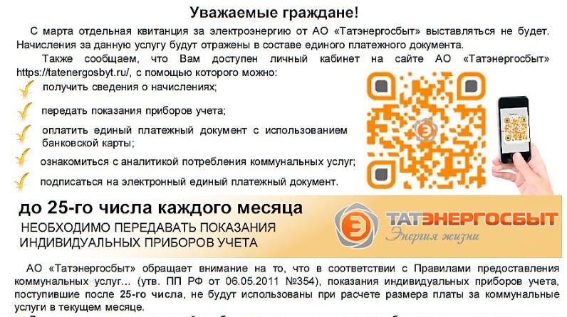 Обращаем ваше внимание на то, что отдельные счета по услуге электроснабжение от АО «Татэнергосбыт» направляться не будут. С 1 марта начисления за данную коммунальную услугу включены в состав единого платежного документа.