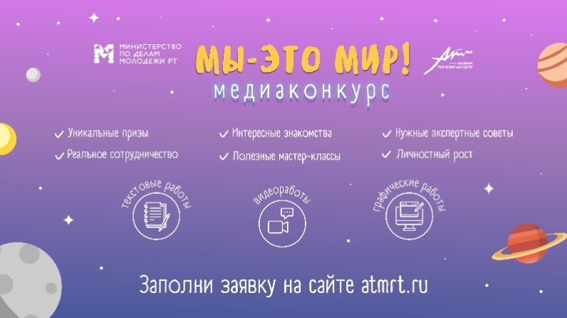 В рамках реализации мероприятий подпрограммы «Профилактика терроризма и экстремизма в Республике Татарстан на 2014-2022 годы» Министерством совместно с Региональной общественной организацией «Академия творческой молодежи Республики Татарстан» при поддержке аппарата Антитеррористической комиссии в Республике Татарстан в период с 1 июня по 1 сентября 2020 года реализуется Республиканский медиаконкурс «Мы – это мир!».