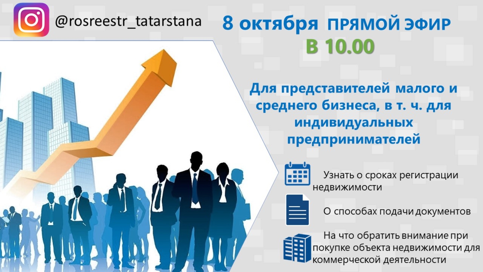 8 октября в 10:00 ч Управление Росреестра по Республике Татарстан проведёт в Инстаграм прямой эфир по вопросам оформления недвижимости для представителей малого и среднего бизнеса, в том числе индивидуальных предпринимателей.