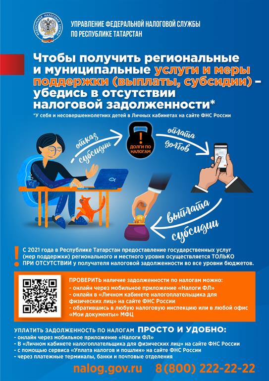 Чтобы получить региональные и муниципальные услуги и меры поддержки(выплаты, субсидии)-убедитесь в отсутствии налоговой задолженности