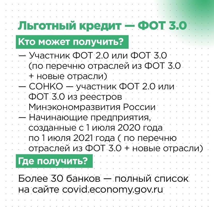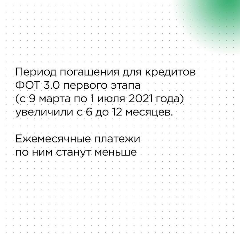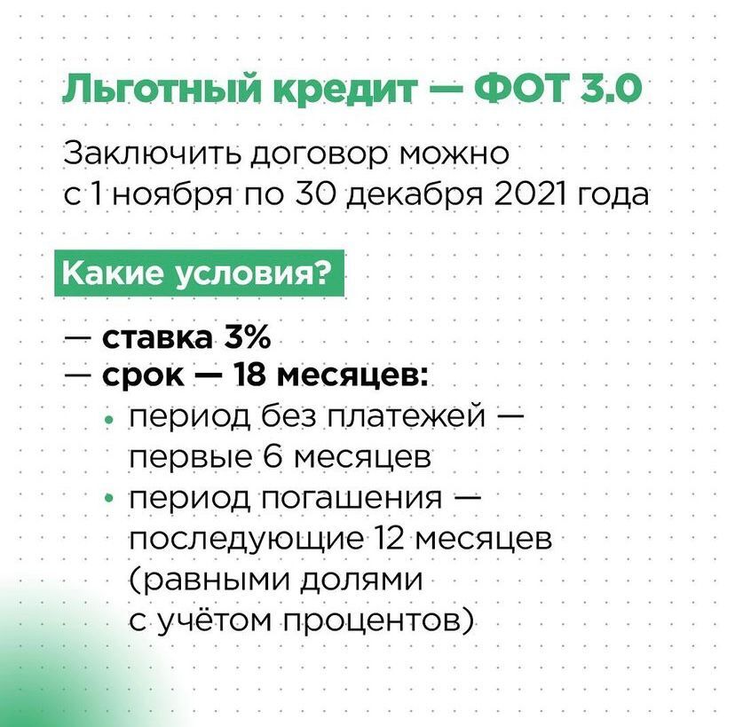 Выдача новых кредитов по программе «ФОТ 3.0» продлится с 1 ноября до 30 декабря 2021 года.