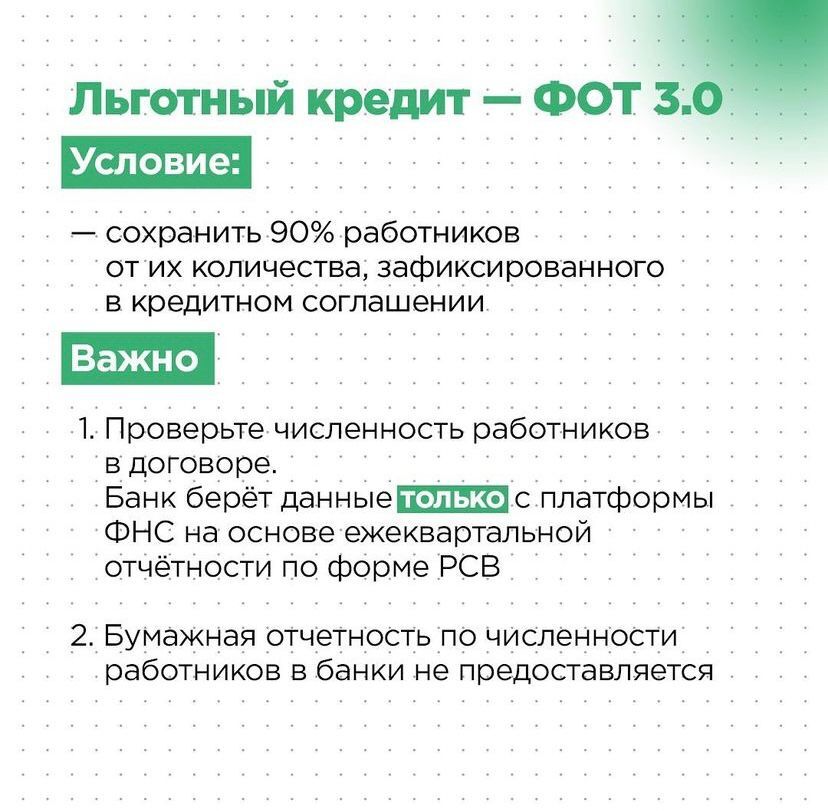 Важное условие по льготному кредиту: компаниям необходимо сохранить численность сотрудников на уровне не ниже 90 %. Этот показатель будет контролироваться через данные ФНС.