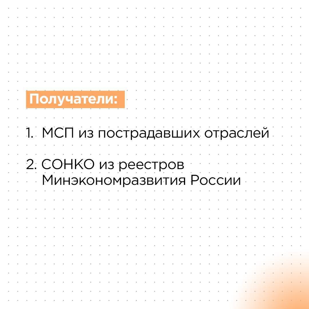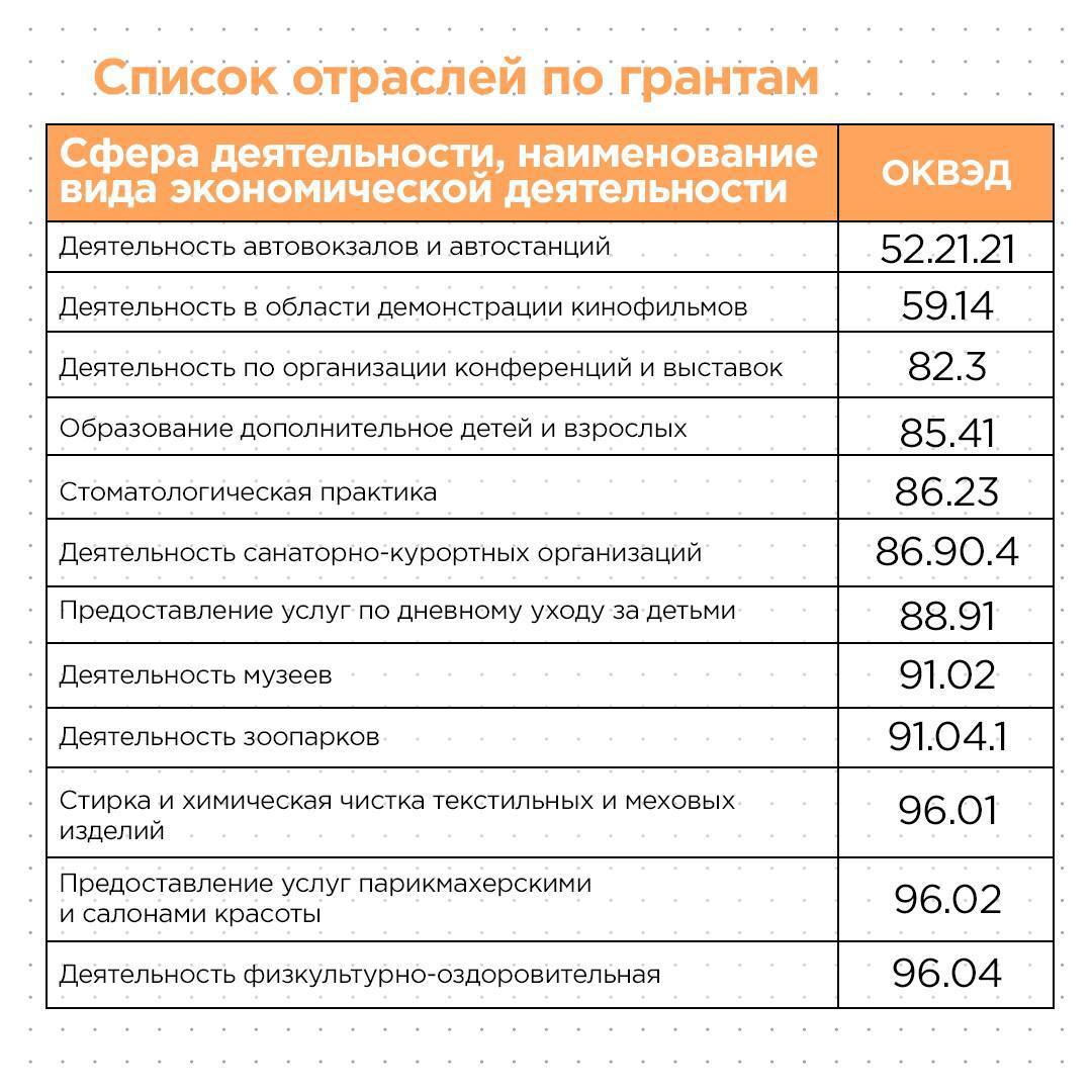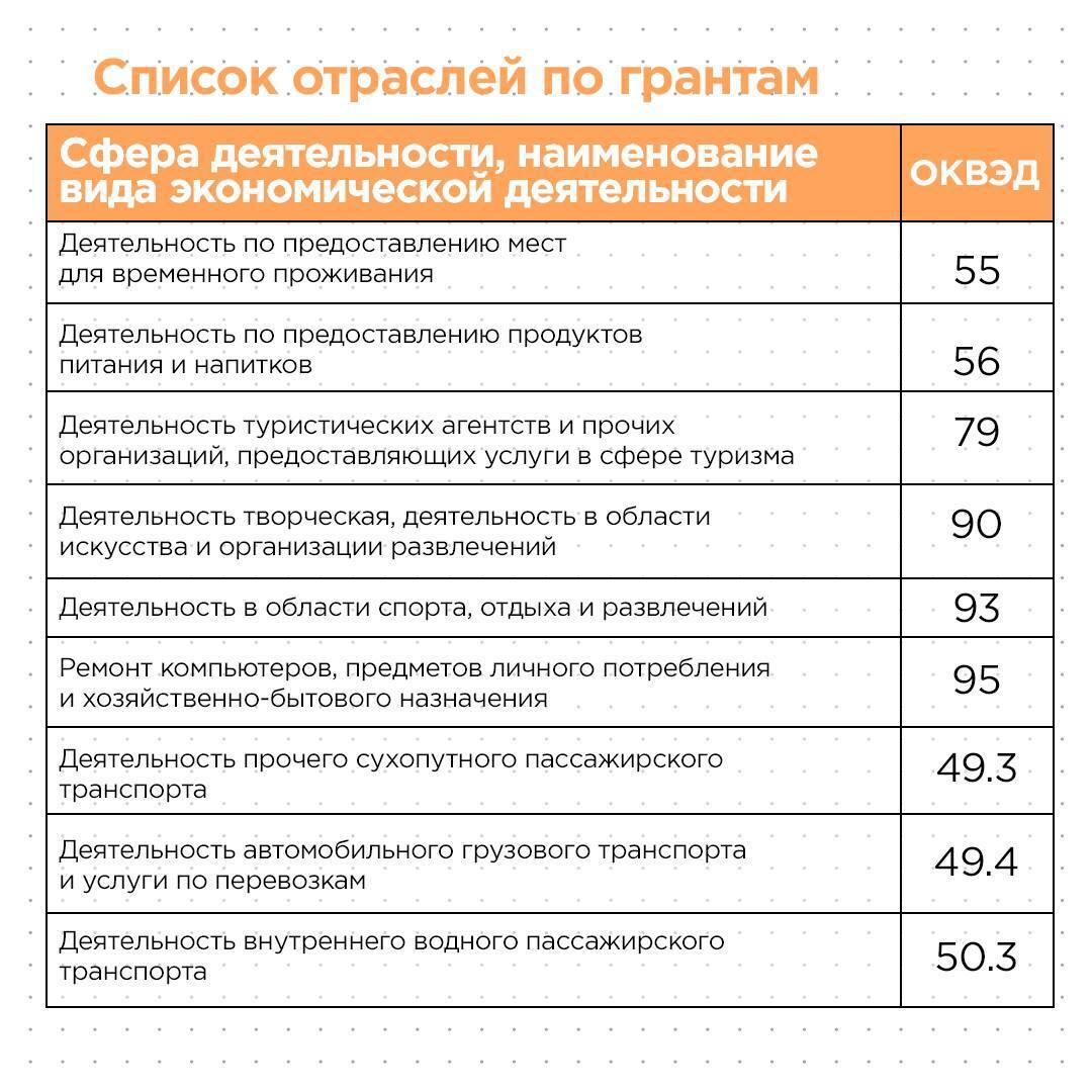 На грантовую поддержку могут рассчитывать предприятия МСП, ведущие деятельность в отраслях спорта, гостиничного бизнеса, общепита, сфере дополнительного образования, бытовых услуг, культуры, организации досуга и развлечений и некоторых других. Ознакомиться с предварительным списком получателей поддержки можно на сайте Минэкономразвития России.
