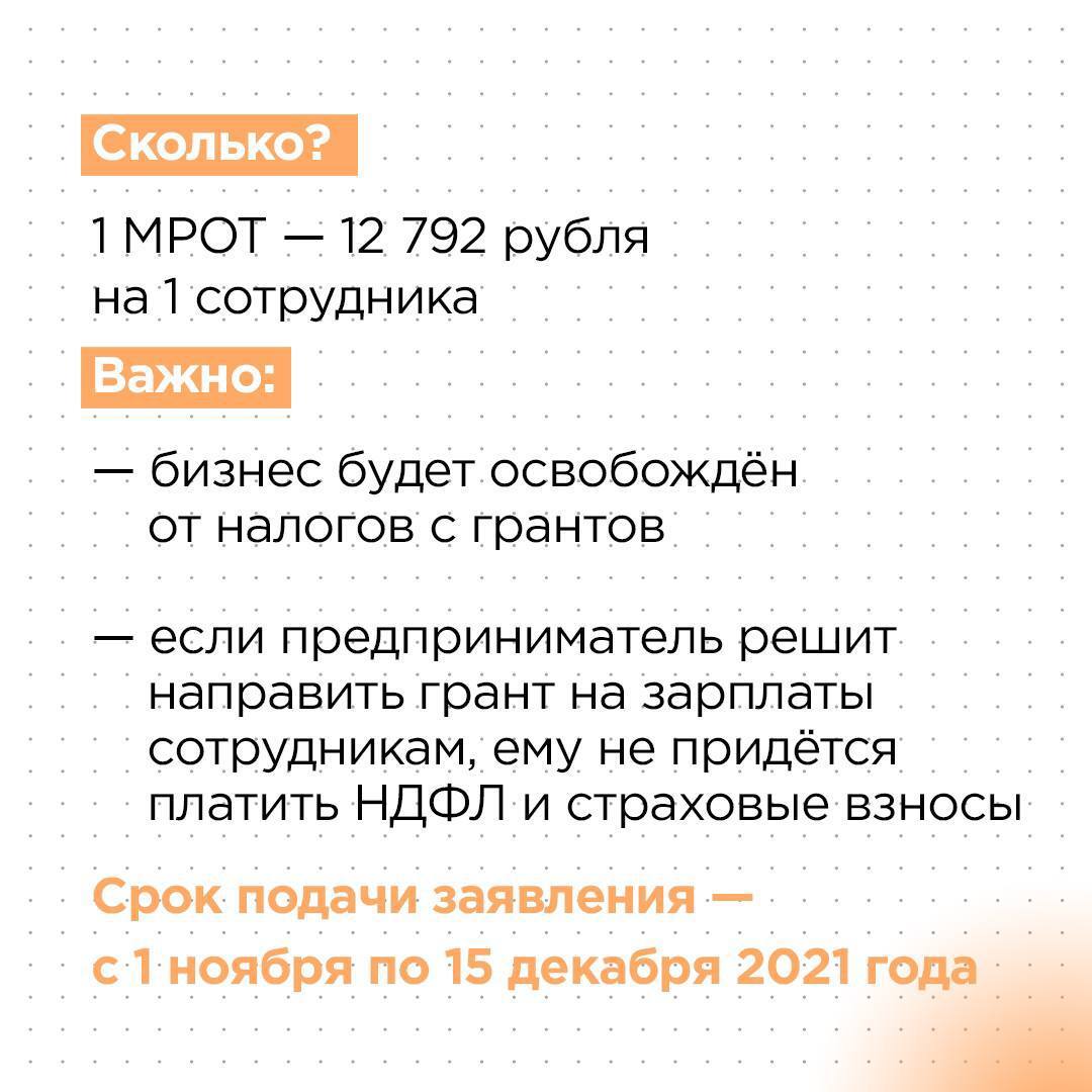 Сумма гранта будет определяться в зависимости от количества работников – в расчете 1 МРОТ на 1 занятого, включая самого индивидуального предпринимателя и позволит в том числе обеспечить выплату заработных плат сотрудникам. Общий объём такой поддержки составит порядка 38,5 млрд рублей.
