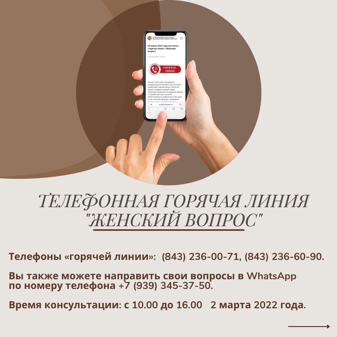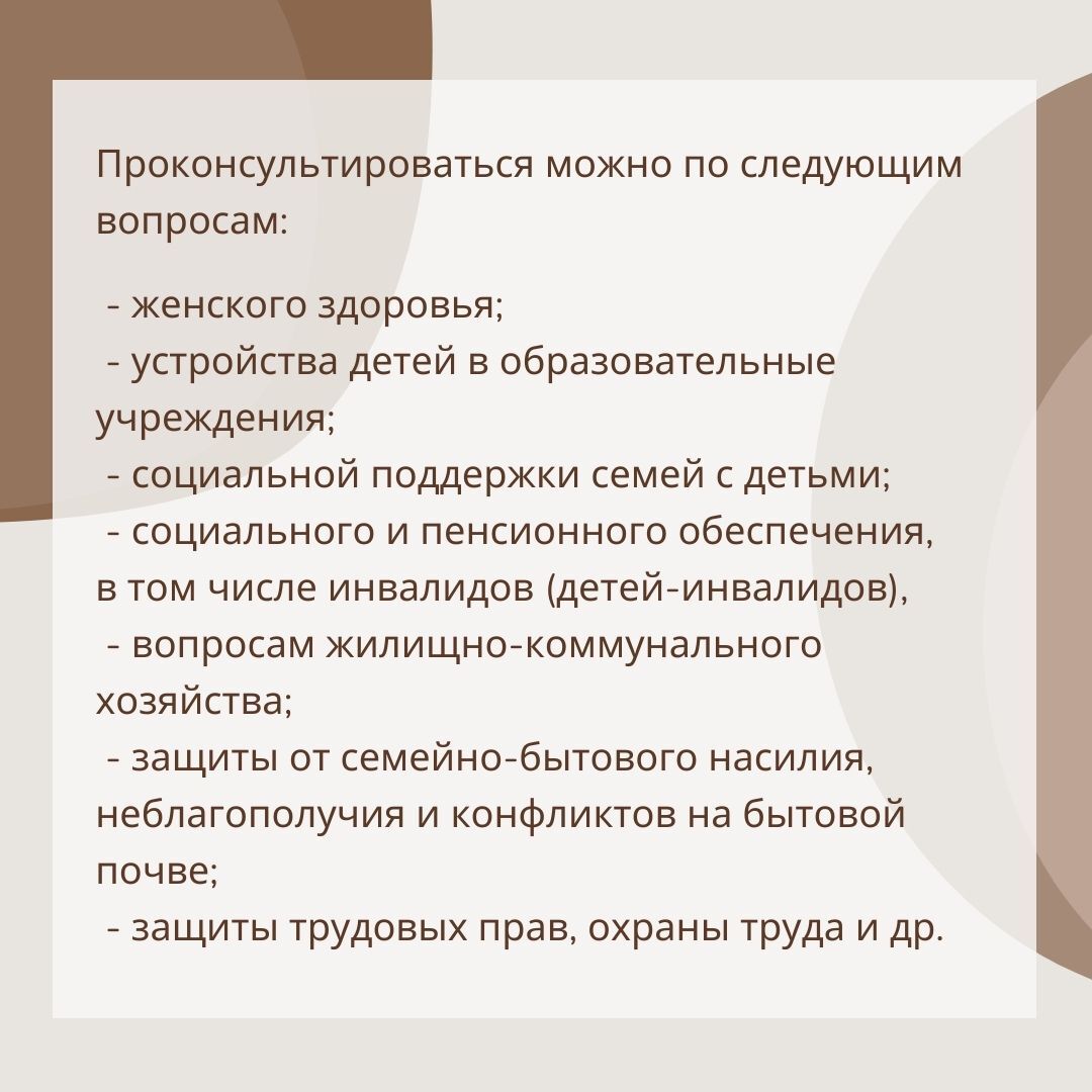 2 марта 2022 года, в преддверии международного женского дня, пройдет телефонная «горячая линия» «Женский вопрос» по вопросам защиты от семейно-бытового насилия, неблагополучия и конфликтов на бытовой почве, женского здоровья, соблюдения трудовых прав, устройства детей в образовательные учреждения, социальной защиты и социального обеспечения семей с детьми, вопросам жилищно-коммунального хозяйства и др.