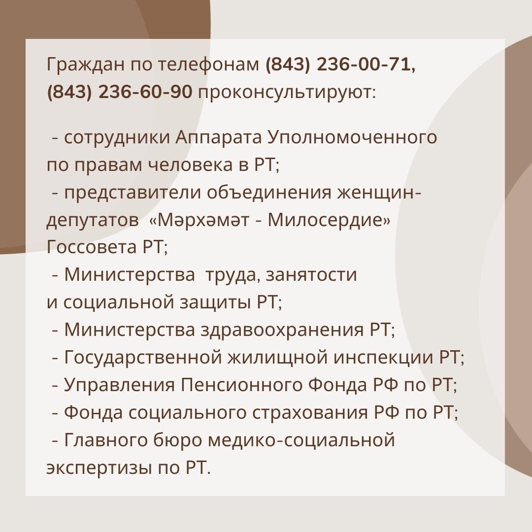 Реализуя поставленные Законом Республики Татарстан от 03.03.2000 № 95 «Об Уполномоченном по правам человека в Республике Татарстан» задачи по содействию в соблюдении прав и свобод человека и гражданина, взаимодействию государственных органов Республики Татарстан в защите прав и свобод человека и гражданина Уполномоченным по правам человека в Республике Татарстан продолжается практика проведения совместных тематических телефонных «горячих линий».