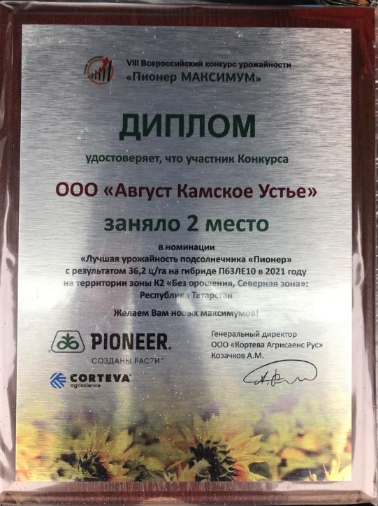 Среди более 60 сельхозпредприятий Республики Татарстан, использующих семена Pioneer, «Август-Камское Устье» на поле близ села Балтачево показала высокий результат на гибриде подсолнечника П63ЛЕ10 с урожайностью 36,2 ц/га.