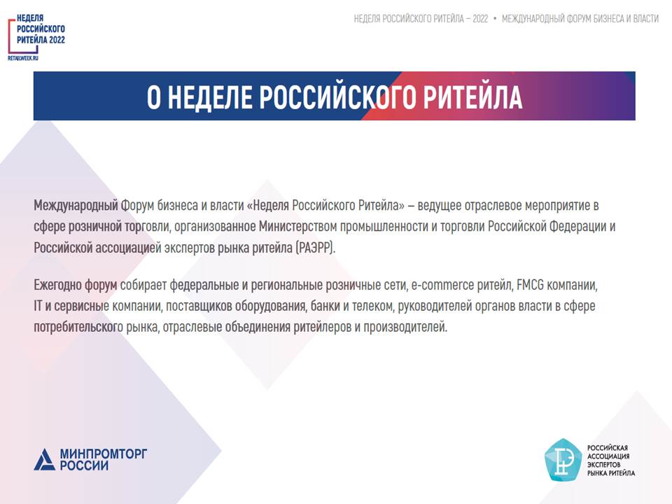 С 6 по 9 июня 2022 года в Москве, в Центре Международной Торговли проводится VIII Международный форум бизнеса и власти «Неделя Российского Ритейла». Предварительная программа мероприятия опубликована на официальном сайте https://retailweek.ru/.