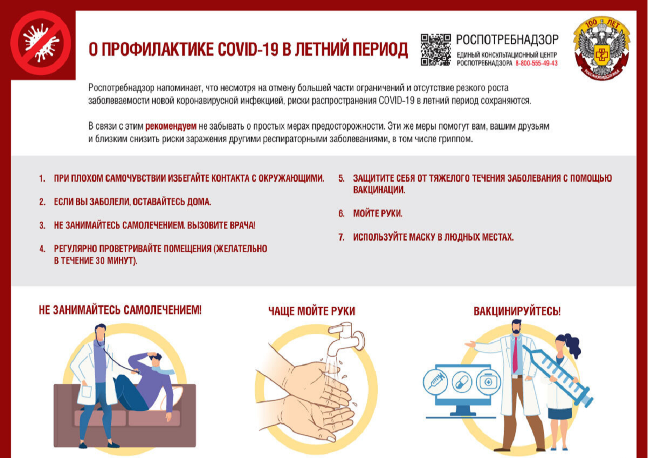 Роспотребнадзор напоминает, что несмотря на отмену большей части ограничений и отсутствие резкого роста заболеваемости новой коронавирусной инфекцией, риски распространения COVID-19 в летний период сохраняются.