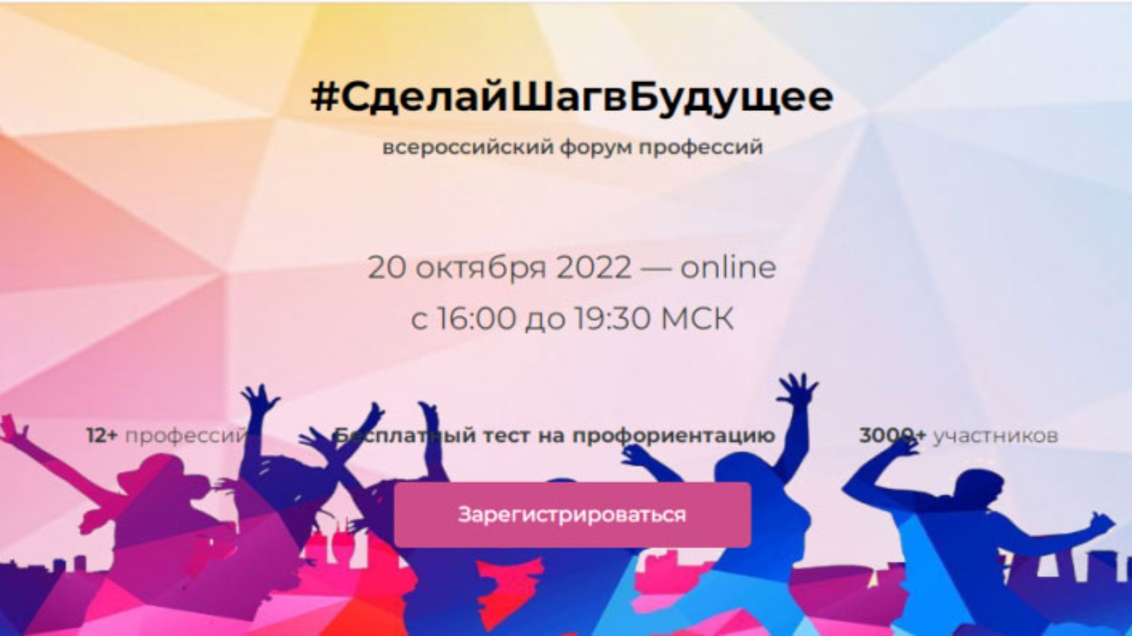 20 октября с 16:00 до 19:30 в онлайн-формате на портале о профессиях и профориентации WOWPROFI.ru пройдет Всероссийский форум профессий #СделайШагВБудущее. https://wowprofi.ru/events/sdelaishagvbudushee.