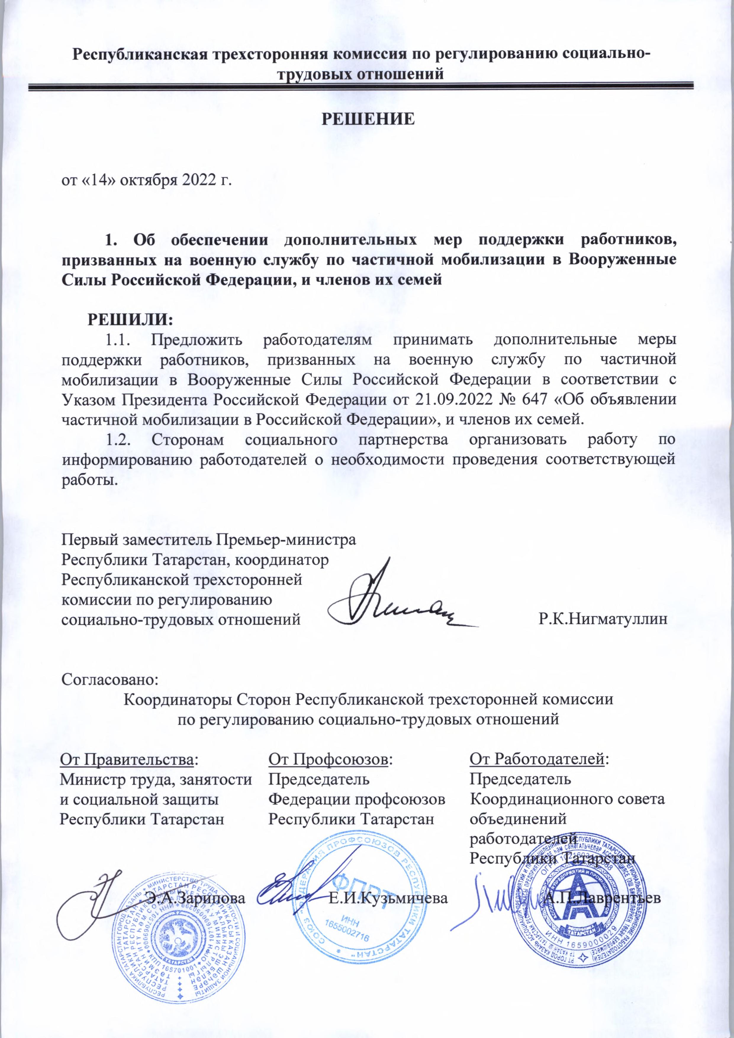 Решение Республиканской трехсторонней комиссии по регулированию социально-трудовых отношений от 14 октября 2022 "Об обеспечении дополнительных мер поддержки работников, призванных на военную службу по частичной мобилизации в Вооруженные Силы Российской Федерации и членов их семей".