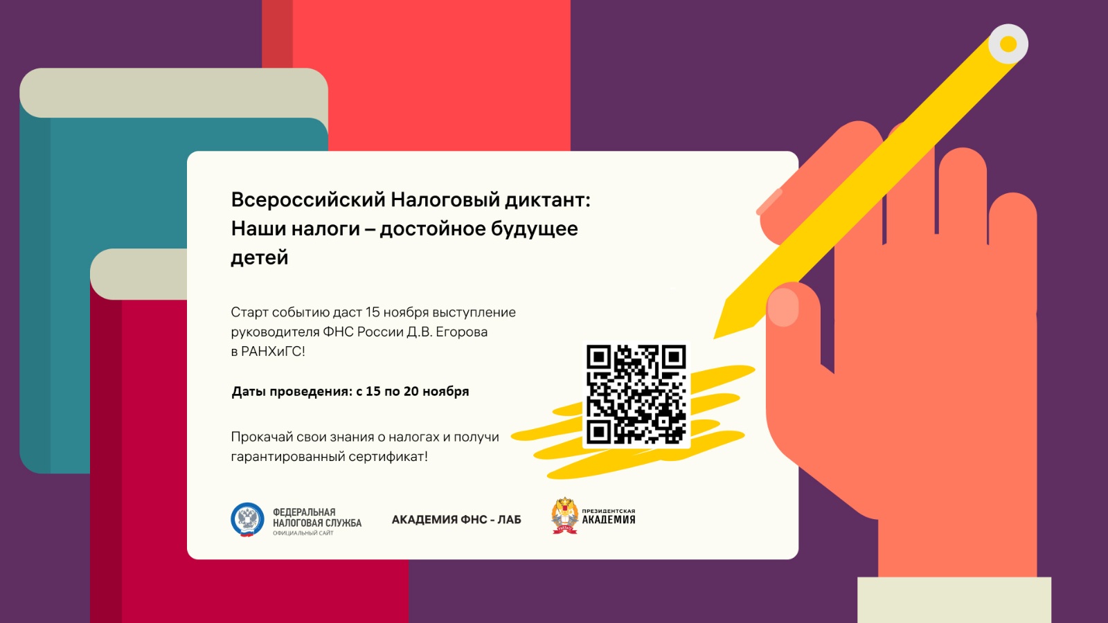 ФНС России с 15 по 20 ноября 2022 года проводит Всероссийский Налоговый диктант «Наши налоги – достойное будущее детей», призванный развить интерес к налоговым знаниям и определить фактическое состояние уровня налоговой грамотности.