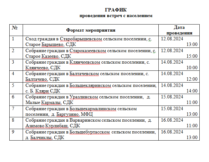Сходы предварительно продолжатся до 26 августа. В них принимает участие Глава Камско-Устьинского района, а также его заместитель, руководители служб и ведомств района.