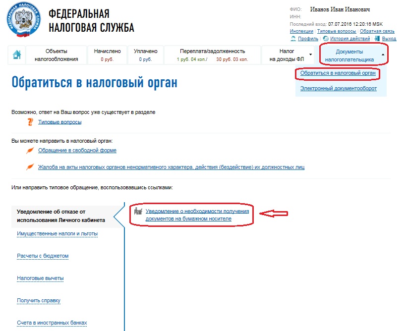 Направить в налоговый орган уведомление о необходимости получения документов на бумажном носителе можно любым из двух способов: