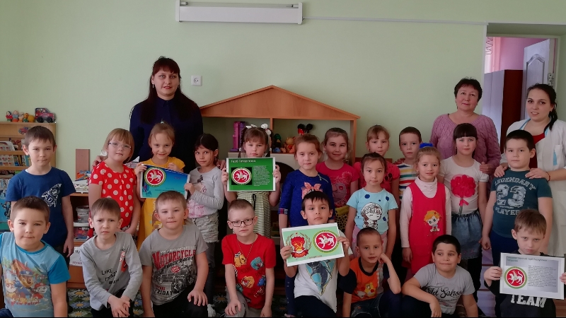Кама Тамагы муниципаль районы балалар китапханәсе хезмәткәрләре «Радуга» 1 нче балалар бакчасының «А» әзерлек төркеме балалары белән «Республикабыз Гербы» дигән әңгәмә үткәрделәр (тәрбияче: Вазыйхова Г. М.).