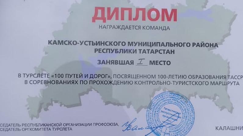 2019 елның 25 һәм 26 маенда Дәүләт һәм муниципаль учреждениеләр хезмәткәрләре профсоюзлары арасында ТАССР оешуга 100 ел тулуга багышланган «100 юл» республика турслеты узды. Безнең команда контроль-туристик маршрутны узу буенча ярышларда 1 нче урынны һәм җирлектәге спорт юнәлеше буенча ярышларда 2 нче урынны алды.
