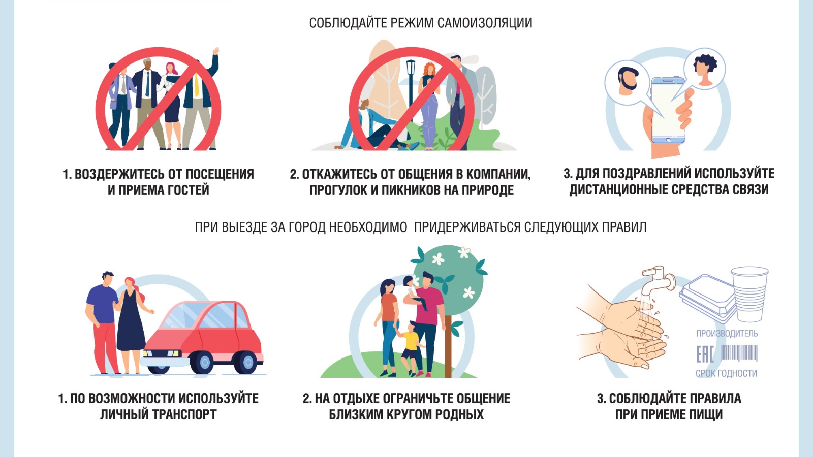 - аралашу даирәсен киңәйтмәгез, май бәйрәмнәрен үзегез изоляциядә булган кешеләр белән Уздырыгыз; дача участогы һәм табигатьтә ял иткән компанияләр белән элемтәләрдән һәм аралашудан сакланыгыз, социаль дистанцияне саклагыз (1,5 м);