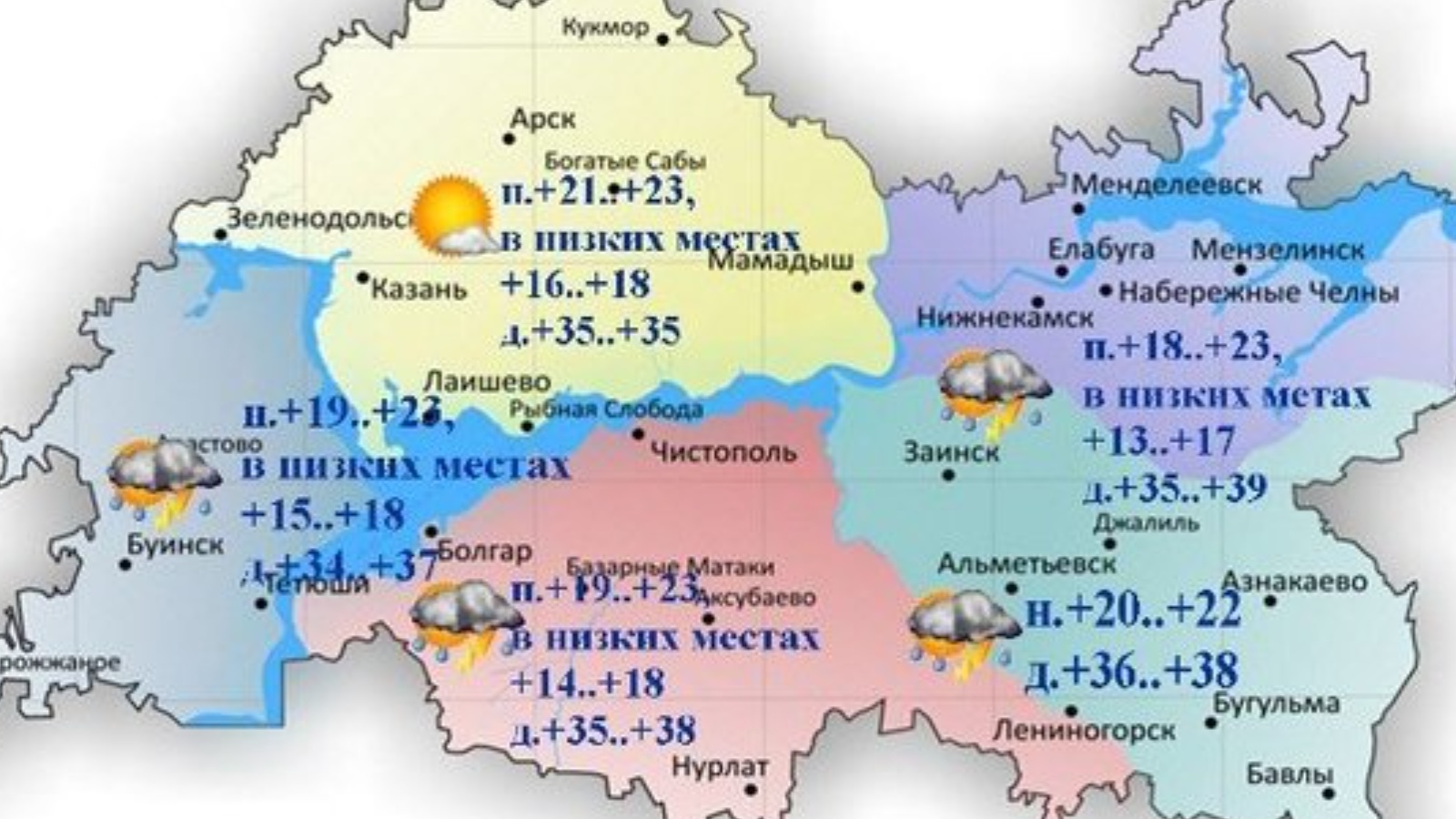 39 градус Уңайсыз метеорологик күренешләр 2021 елның 22 августында төнлә һәм көндез Татарстан Республикасы территориясендә урыны белән яшен, көчле җил 15-20 м/с, көндез җилнең локаль көчәюе 23 м/с, локаль боз көтелә.