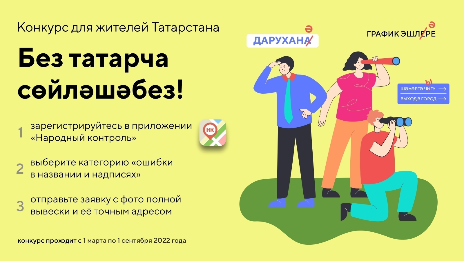 2022 елның 1 мартыннан 1 сентябренә кадәр Татарстан Республикасында яшәүчеләрне татар телендә язуларда элмә такталарда, мәгълүмати табличкаларда, топографик билгеләмәләрдә, юл күрсәткечләрендә һәм аншлагларда хаталарны ачыклауга җәлеп итү буенча конкурс үткәрелә.