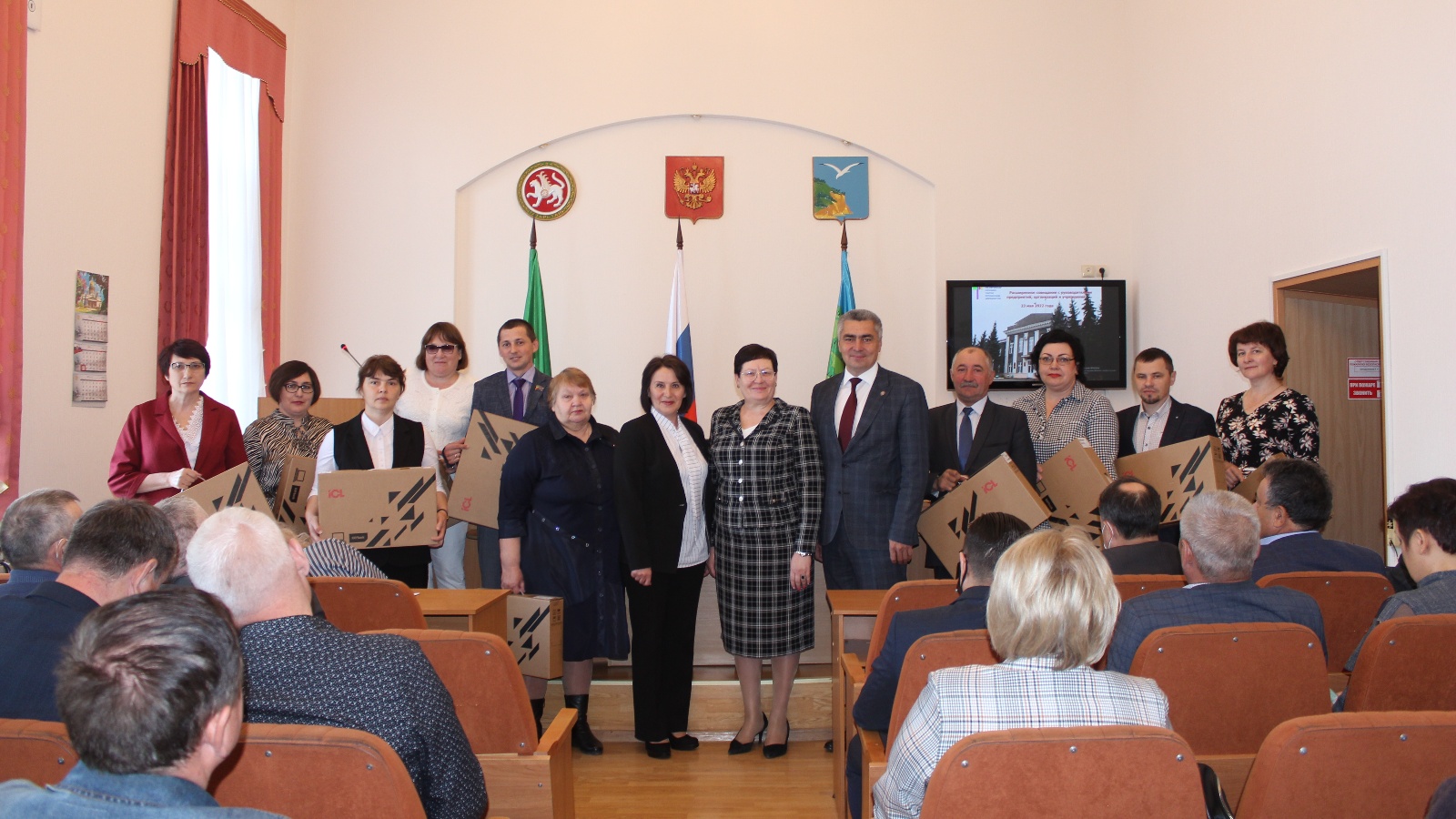 Укытучыларга ноутбукларны Кама Тамагы муниципаль районы башлыгы Вазыйхов Наил Альберт улы, "Ак Барс" Банкының җирле сату офисы җитәкчесе Вера Таҗетдинова белән бергә тапшырдылар.