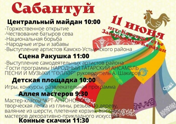 Бәйрәмдә традиция буенча сезне халык уеннары һәм уеннар, район артистлары чыгышы, мастер-класслар, ат чабышлары, милли көрәш һәм спорт-күңел ачу программасы көтә.