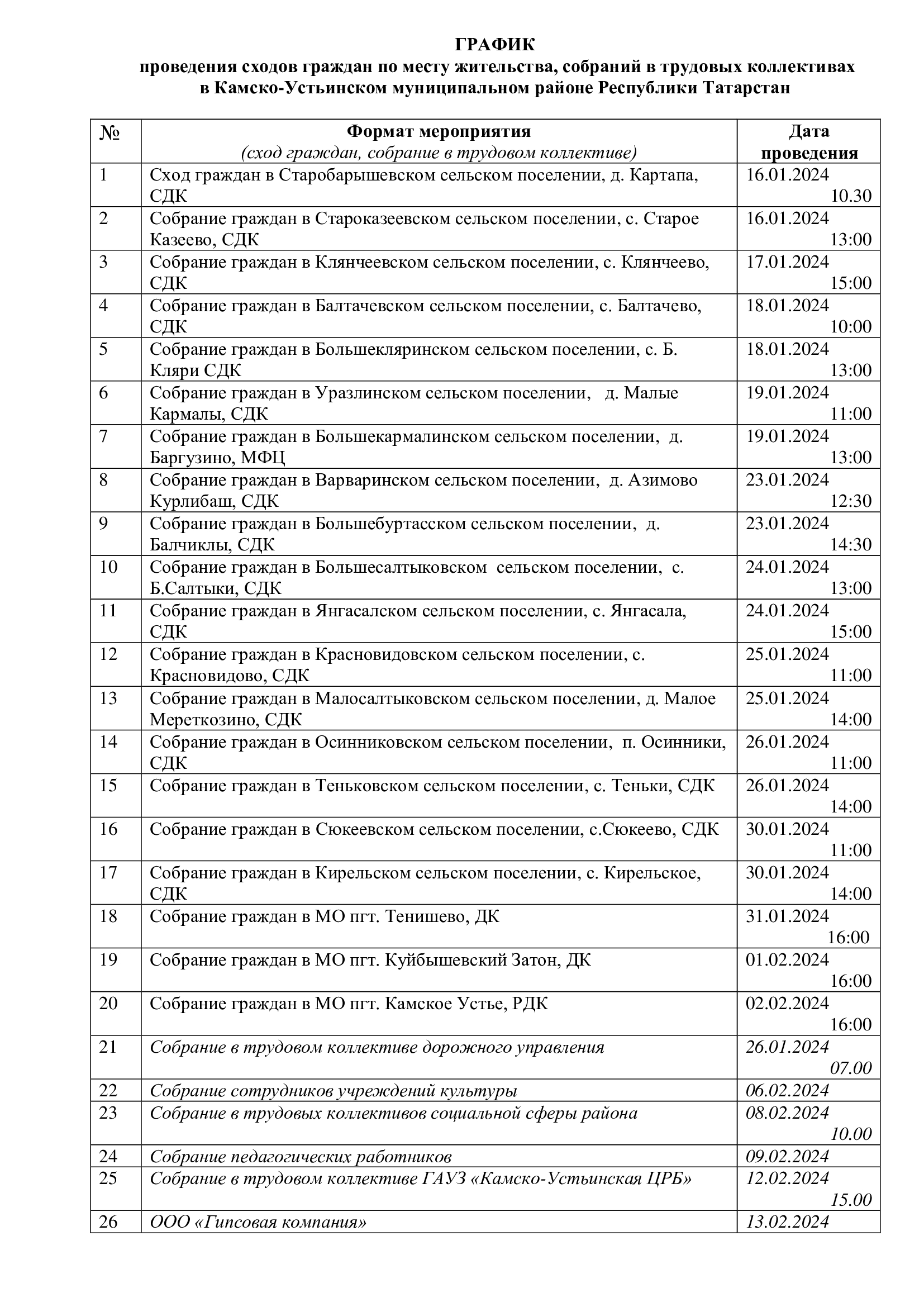 Кама Тамагы районы авыл җирлекләрендә җыеннарның беренчел графигы: